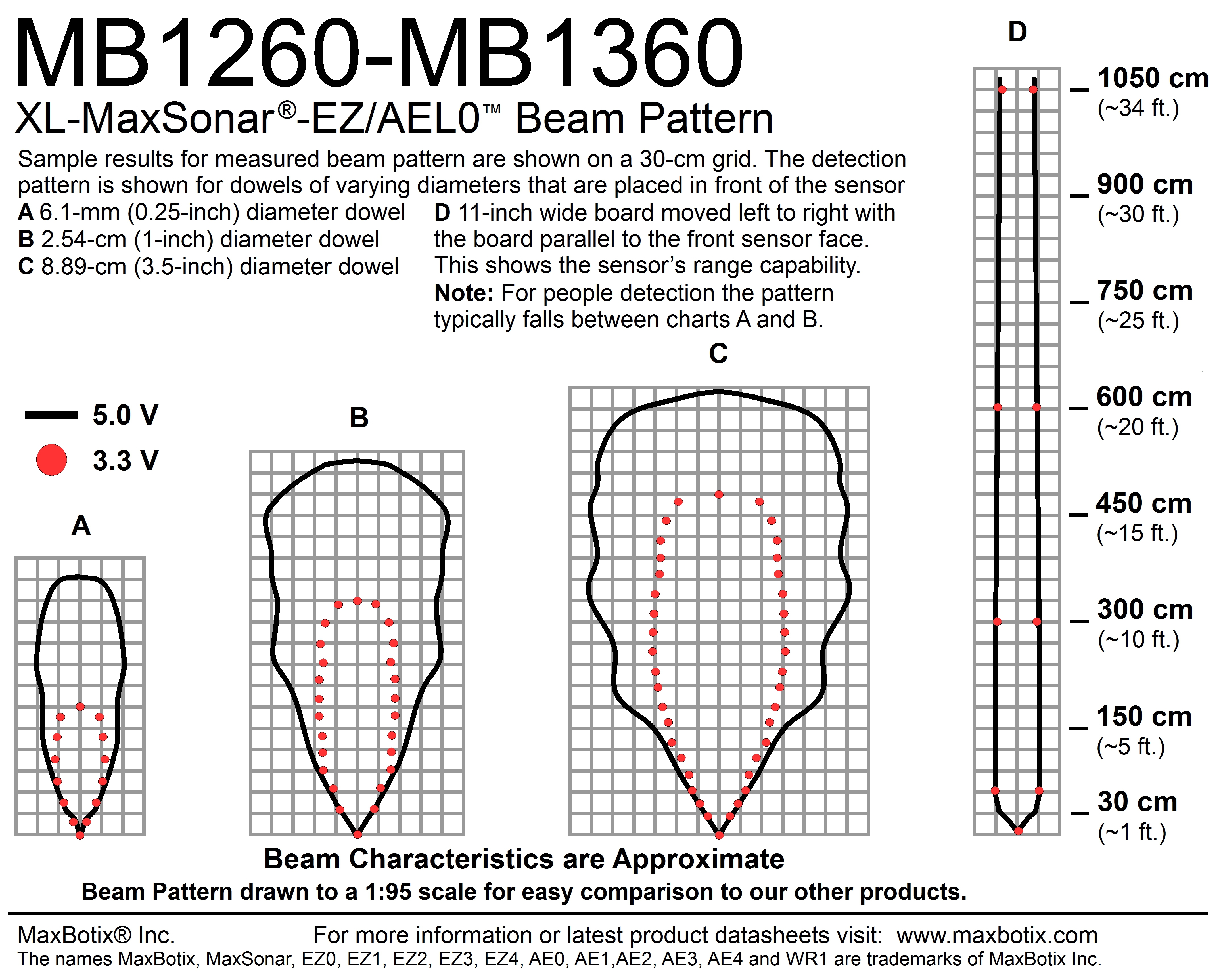 The XL‑MaxSonar‑AEL0 offers the widest and most sensitive beam pattern of any indoor sensor we currently offer. This makes the XL-MaxSonar-AEL0 an excellent choice wherever wide beam detection, reliable people detection, or reliable small obstacle detection are required. In addition to detecting small objects, the XL-MaxSonar-AEL0 can also detect large targets to the extended range of 1068 cm (420 inches).